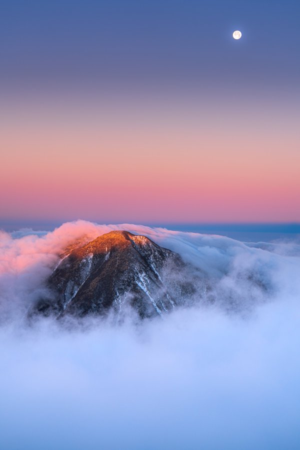 Twitterに投稿された写真「朝焼けに雲海に包まれた三俣山と月」 2023年01月26日 大分県 三俣山 朝焼け こちらはTwitterアカウント「みつ®︎/ Mitsuhide Mori(@mikkun_m)」さんが投稿した写真「朝焼けに雲海に包まれた三俣山と月」です。