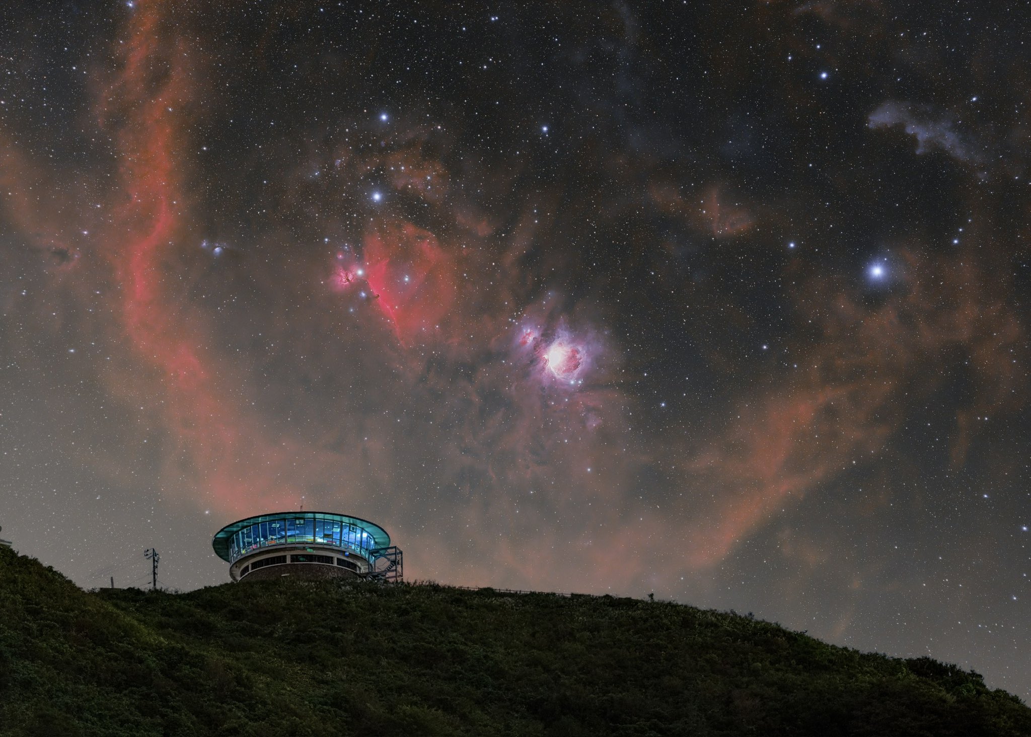 半円で囲むのは「バーナードループ(Barnard's Loop)」(こちらを参照)、その内側で「オリオン座の三つ星」近くにあるのが「NGC 2024(Flame Nebula)」(こちらを参照)、もう一つが「オリオン大星雲(Orion Nebula)」(こちらを参照)です。